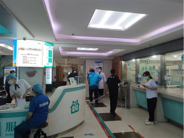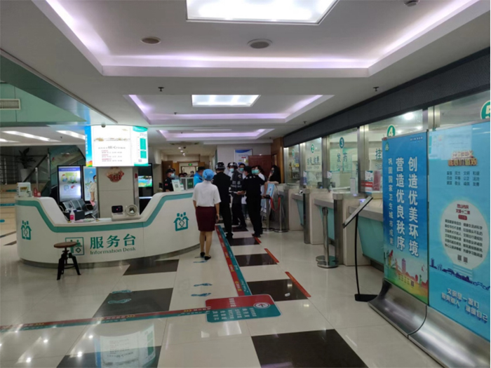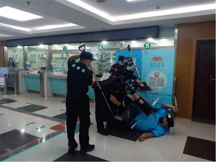 演練現(xiàn)場模擬一暴恐分子持刀強行闖崗,執(zhí)勤保安迅速報保衛(wèi)科及分管領(lǐng)導(dǎo),并撥打110報警電話,同時疏散就醫(yī)群眾和工作人員。